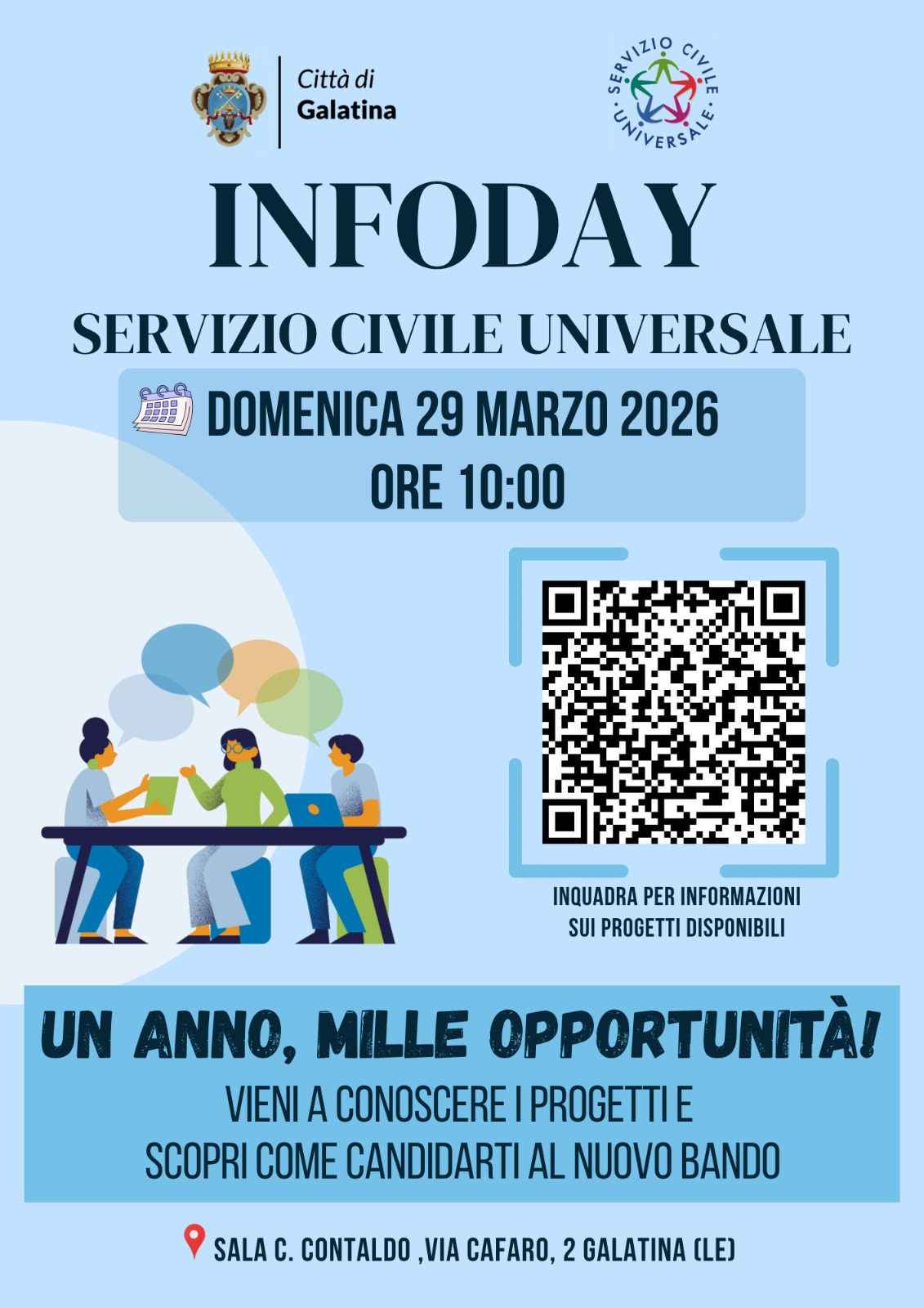 Lo scorso 24 febbraio il Dipartimento per le Politiche giovanili e il Servizio civile universale ha pubblicato il Bando per la selezione di 65.964 operatori volontari in Italia e all'estero, con scadenza alle ore 14:00 dell'8 aprile 2026. Per il Comune di Galatina è prevista la selezione di complessive 28 unità da impegnare in 5 differenti progetti. Pertanto, al fine di far conoscere il bando, i requisiti di partecipazione, le modalità di presentazione delle domande e i progetti disponibili, la Città di Galatina e gli operatori volontari del Servizio Civile Universale attualmente in servizio organizzano un Infoday dedicato al Servizio Civile Universale: un’importante occasione di informazione e orientamento rivolta ai giovani del territorio.